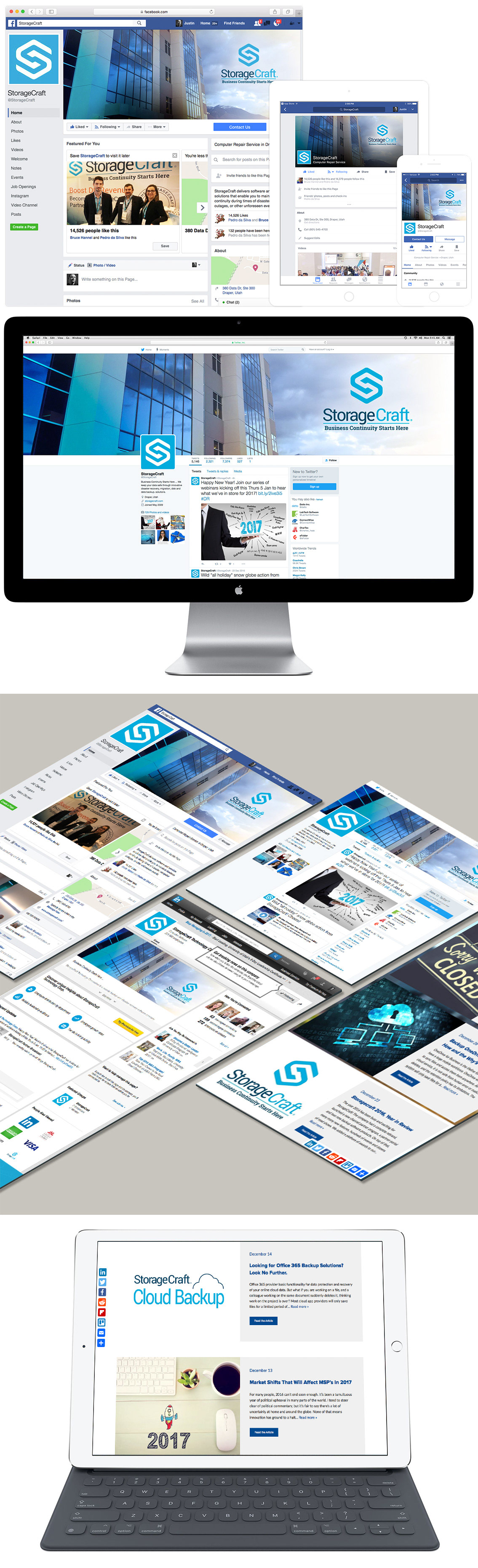 An effective social media presence, with regular updates of quality content, can make all the difference in growing a business. The number of Facebook friends, Twitter followers, LinkedIn connections, and blog visitors has grown exponentially at StorageCraft because we have increasingly been able to provide the content that our audience is looking for as we continue to rev our social media engine on a regular basis. Increasing leads and sales has been the result as our numbers have continued to climb. Our social media manager has never reported a down week in his weekly reports for more than three years! I’ve regularly provided graphics, photography, videos, and other important creative content to have implemented throughout the most popular social media channels.